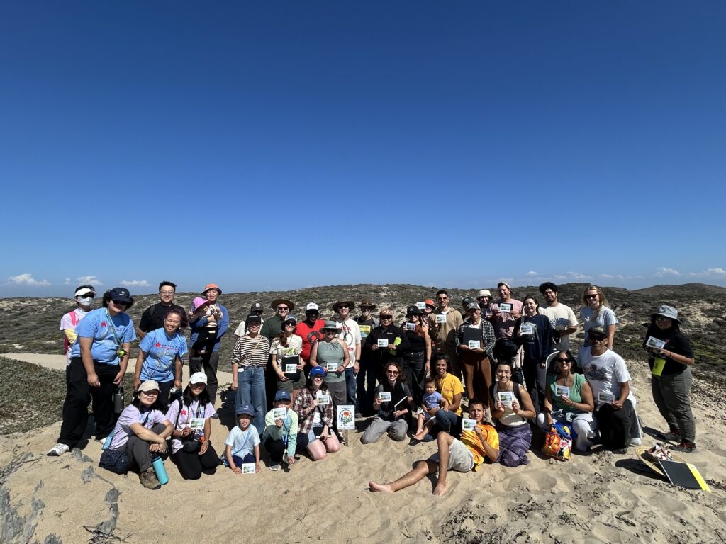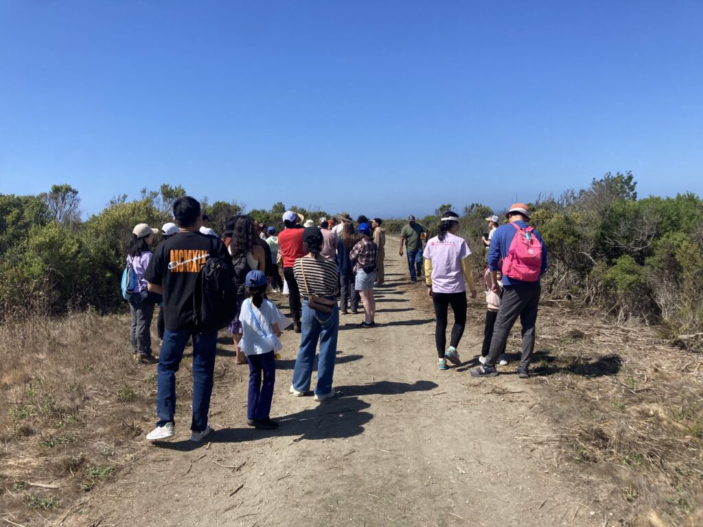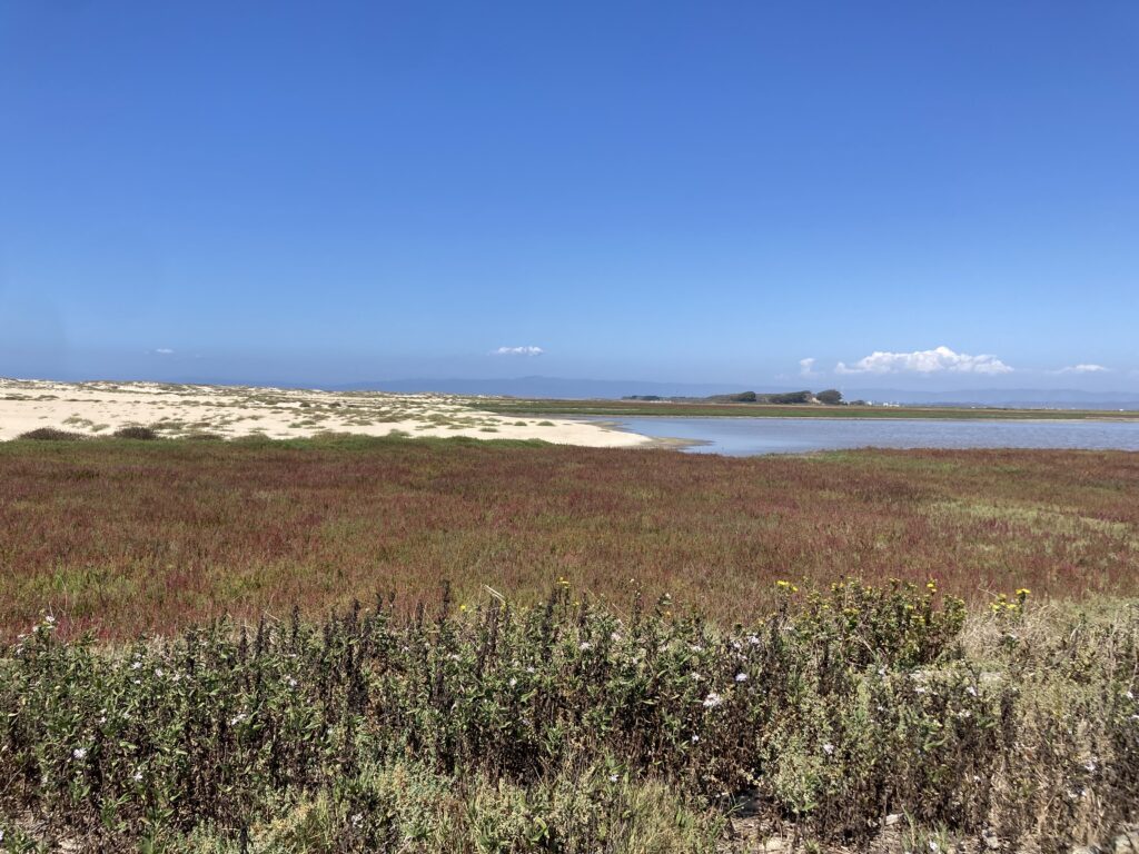 By this time in the afternoon, I had fallen in love with this ocean and river meeting place. We stopped to admire the view of the iconic Salinas River a bit of a way off, and several of us delighted together in discovering sweat bees and other native bees darting in and out of nests on the ground. We looked for “eggs” placed by the volunteers for us to find without getting off of the trail. Once on the beach, we had time to sit and take in the ocean, the warm sand and sun, the sky overhead and an occasional sighting of a plover. The day had been filled with conversation, so I appreciated the opportunity to silently take in the sounds, smells and feelings of the beach. It was good to come back into community together again though, as we all gathered once more for a 360 degree view of the Refuge and Ocean. Someone spotted dolphins in the water and a collective “oooo” went up as we saw them resurface.