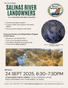 Beavers can help! Learn how by joining us for a community conversation about beavers on Wednesday, September 24th, from 6:30-7:30pm at the Atascadero Library.
